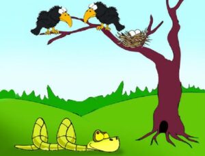 Once a crow and his wife built their nest atop a huge banyan tree beside a river. They were very happy there. But when the female crow laid her eggs, they were in for an unpleasant shock. A huge snake who lived in a hole at the bottom of t