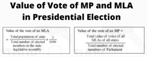 The value of the vote of each MP and MLA differs in accordance with the number of members in their legislative body. Further, each elector casts a different number of votes. The general principle is that the total number of votes cast by Members of parliament equals the total number of votes cast by State Legislators. Also, legislators from larger states cast more votes than those from smaller states